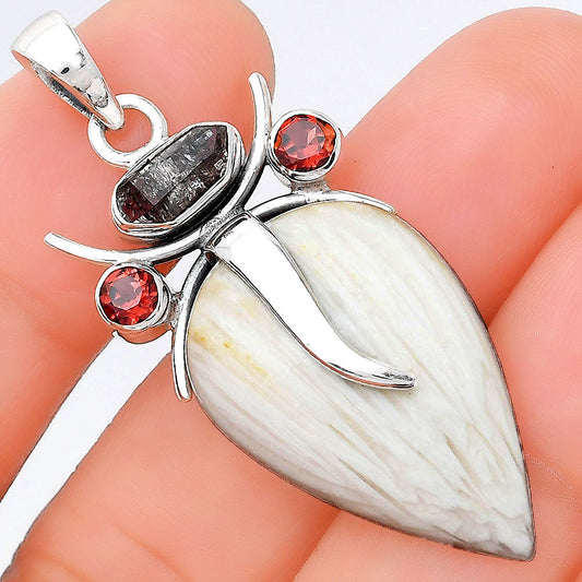 Lord Ganesha White Scolecite, Herkimer Diamond & Garnet Silver Pendant P-1588 SDP155156