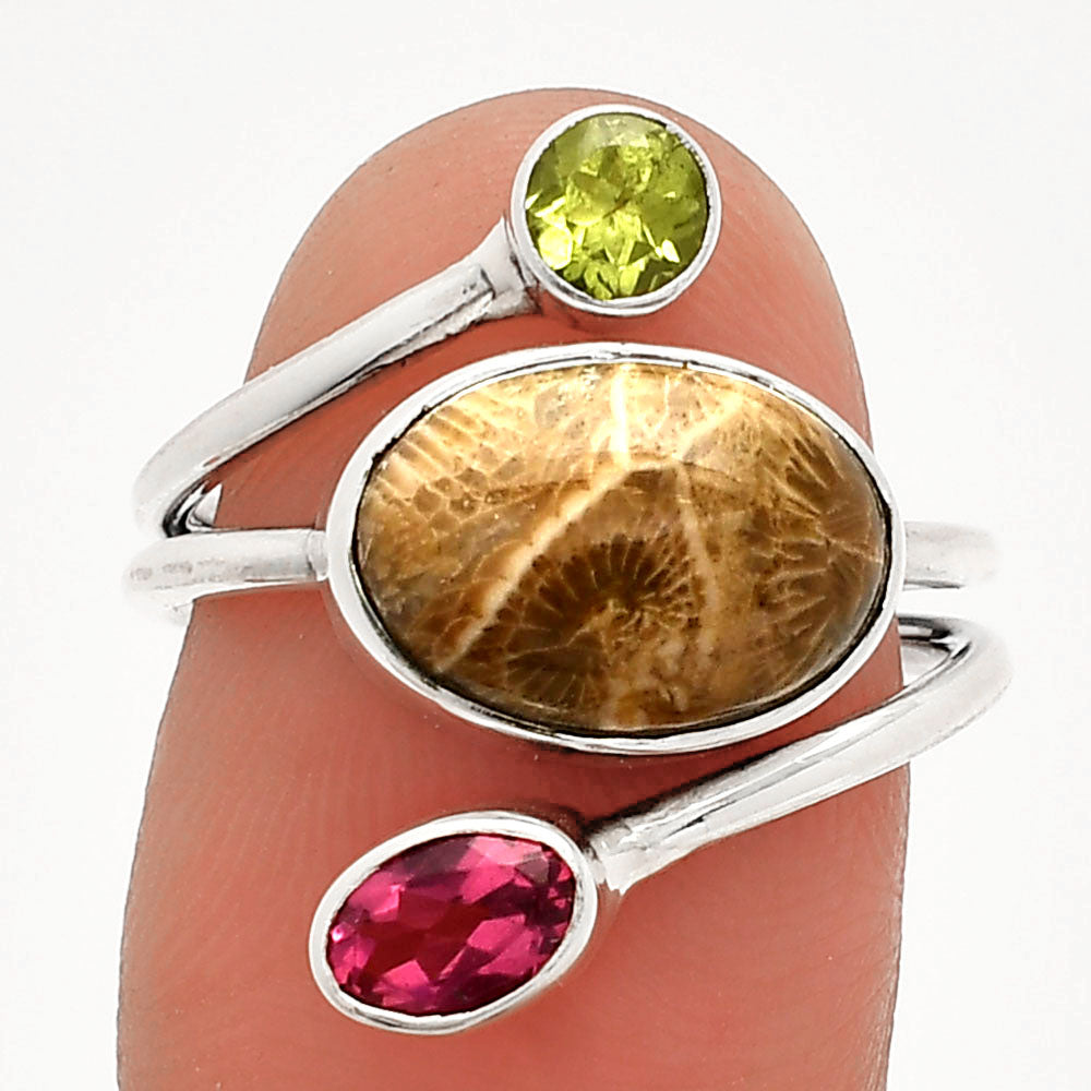 Flower Fossil Coral, Garnet & Peridot Ring size-7 R-1209 SDR232042