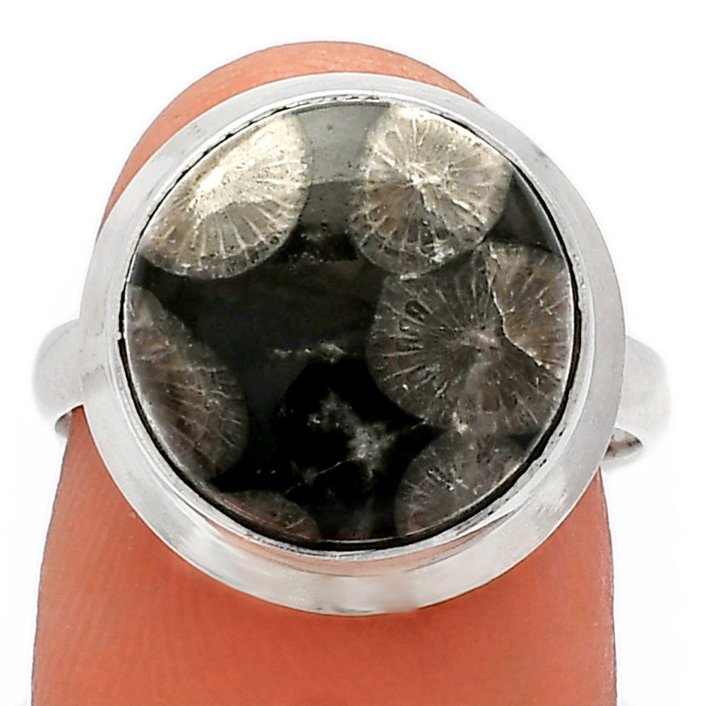 Natural Black Flower Fossil Coral Ring size-7 R-1007 SDR226407