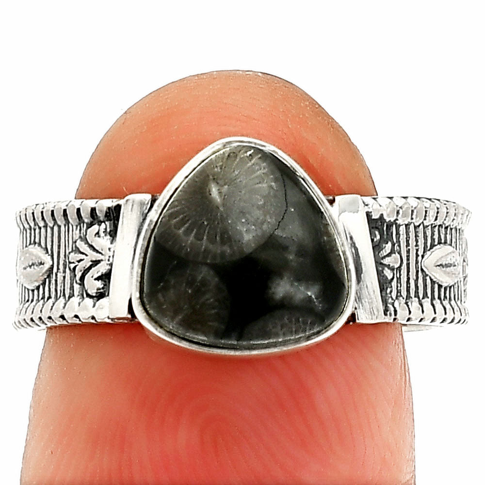 Natural Black Flower Fossil Coral Ring size-8 R-1058 SDR235513