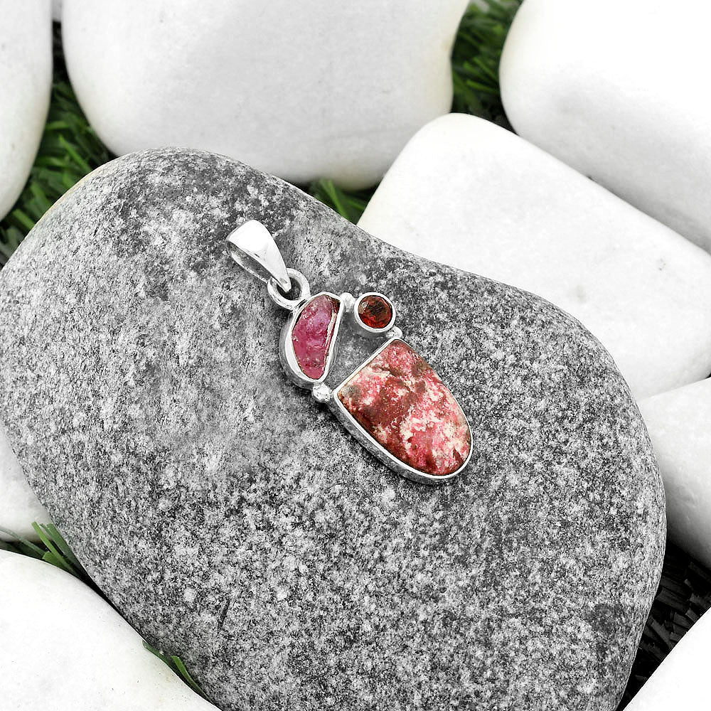 Pink Thulite, Pink Tourmaline Rough & Garnet Pendant P-1203 SDP118094